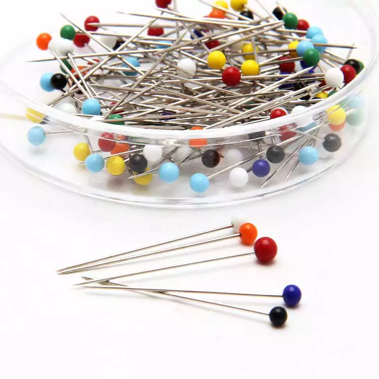 Alfinetes com cabeça colorida de vidro, 31mm, perfeitos para costura e trabalhos manuais, garantindo praticidade e visualização fácil durante o uso.