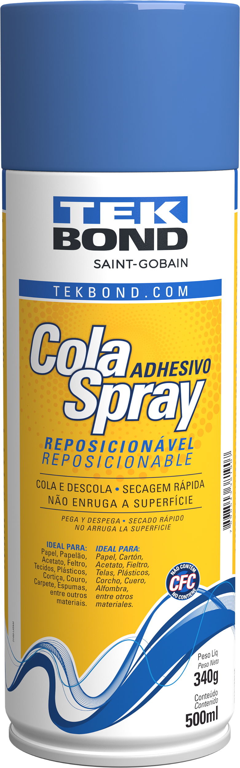 A Cola Spray Reposicionável da Tekbond foi especialmente desenvolvida para fixar superfícies Colagem com precisão e evita desperdícios, não escorre e não enruga superfícies facilitando o procedimento. A Cola Spray Tekbond para fixação temporária adere uma grande variedade de materiais, possui uma excelente transparência e um alto poder de cobertura.