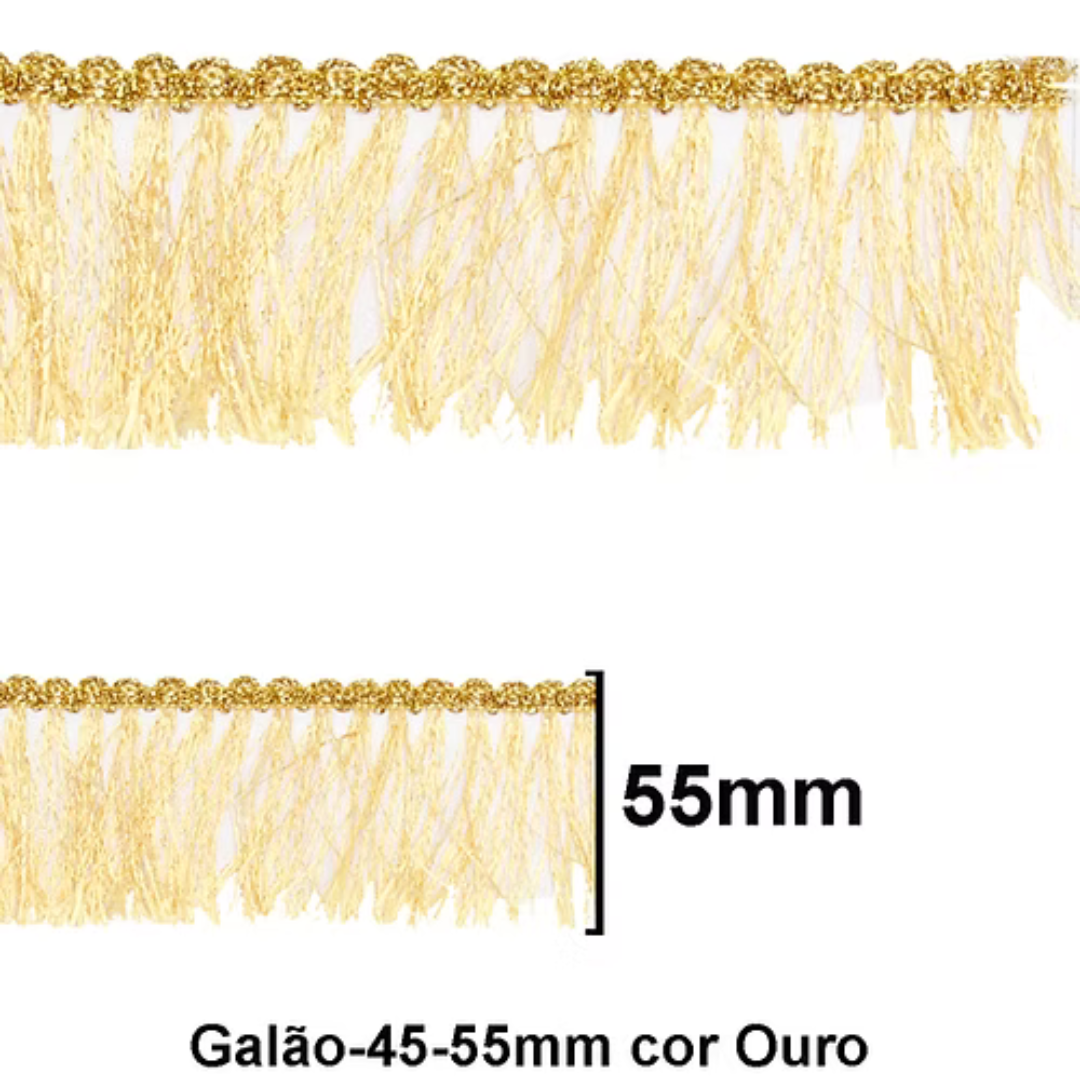 O galão é confeccionado em material resistente com uma tonalidade dourada que não desbota com facilidade. Seu formato com franjas traz textura e movimento às peças em que é aplicado, medindo 55mm de altura com 20 metros disponíveis, perfeito para projetos que exijam um toque elegante.