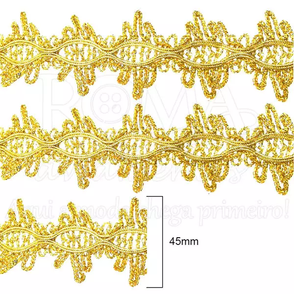 Descubra o Galão Passamanaria Ref:Galao-47 na elegante cor ouro, com largura de 45mm e 20 metros de comprimento. Ideal para projetos de artesanato e decoração, este galão apresenta acabamento sofisticado que valoriza peças de vestuário, acessórios e artes manuais com acabamento profissional. O diferencial está na durabilidade e na textura detalhada, facilitando aplicação em diversos tecidos e materiais com excelente fixação e brilho duradouro.