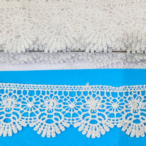 Padrão: O desenho é caracterizado por motivos florais ou rosetas interligados, com um bico ondulado (escalopado) que adiciona um movimento suave e acabamento de alta costura. A borda reta possui uma tira de pequenos pontos, que facilita a costura em tecidos.