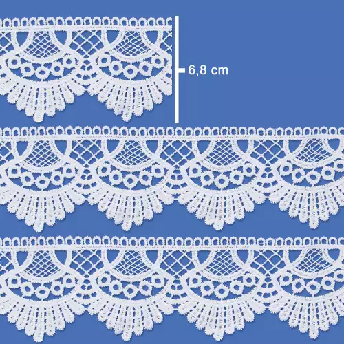 O Guipir branco Ref.CHL-438 de 6,8 cm de largura e 13,7 metros de comprimento é perfeito para trabalhos manuais, confecção e decoração. Sua textura em renda proporciona um acabamento sofisticado e delicado, ideal para roupas, cortinas e artesanato. O material resistente mantém a forma mesmo após lavagens, garantindo durabilidade e qualidade para projetos detalhados.