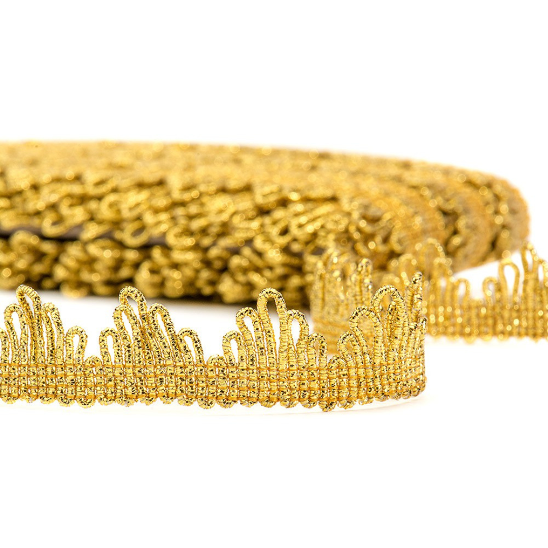 A Passamanaria Metalizada Ouro com 17mm de largura oferece acabamento sofisticado para seus projetos de artesanato e costura. Confeccionada com 35% algodão, 60% fios metalizados e 5% poliéster, garante durabilidade e brilho intenso. Ideal para decoração de roupas, acessórios e peças artesanais, esta passamanaria vem em rolos de 10 metros, facilitando seu uso contínuo e versátil.